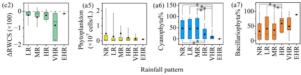 图1.??不同降雨模式对千岛湖街口站水体稳定度(RWCS)、浮游植物密度、蓝藻和硅藻占比的影响(2017–2020年)。LR:小雨(0–10??mm);MR:中雨(10–25 mm);HR:大雨:(25–50 mm);VHR:暴雨(50–100 mm);HER:大暴雨(>100??mm)
