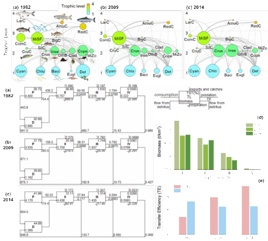 图 3. 呼伦湖1982–2014年食物网结构与能量流动变化
