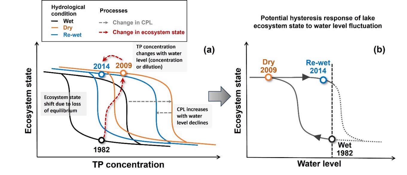 ????PCLake 模型进一步证实,水深2.6米是湖泊生态结构与功能发生多稳态转换的关键阈值;随后湖泊水深逐步恢复,但生态系统未恢复至初始状态,证实水文干扰可能对湖泊生态造成滞后甚至不可逆影响,凸显了温带湖泊生态系统在剧烈水文变化背景下的脆弱性(图4)(Xue et al., 2025 Journal of Hydrology)。